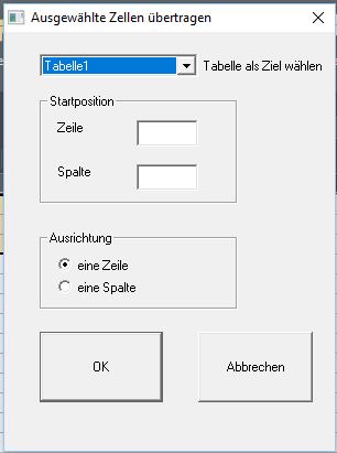 ich denke, es macht nicht viel Sinn, die einzeln markierten Zellen einfach nur per MsgBox auszugeben, Deswegen habe ich folgende Ergänzung vorgenommen: Die markierten Zellen werden in einer Tabelle in einer neuen Zeile bzw. Spalte ausgegeben. Dazu wird beim Start des Skripts ein Dialog aufgerufen: