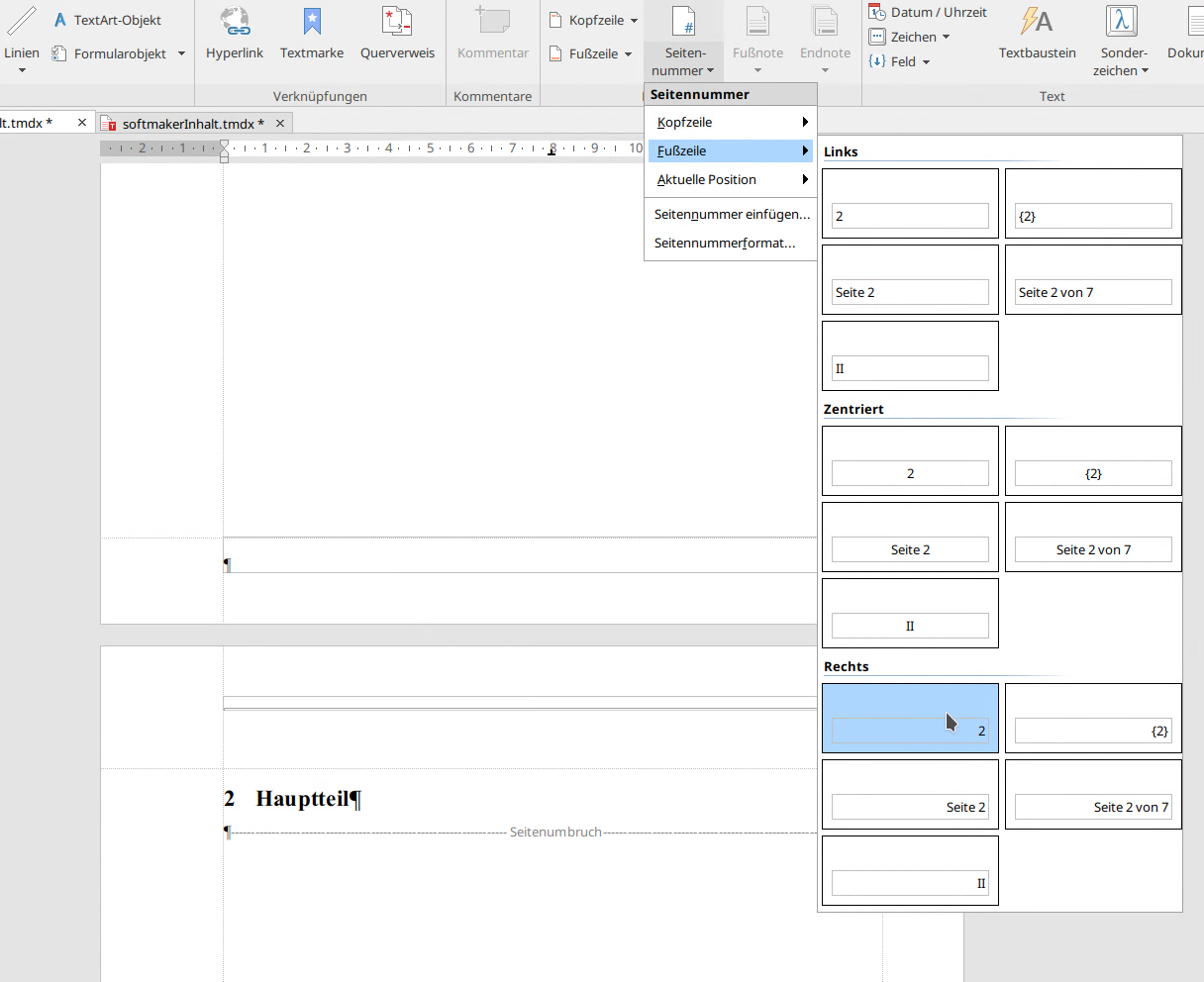 Wenn ich in einem Kapitel mit arabischen Seitenzahlen auf "Seitennummer" und dann "Fußzeile" klicke, kommt das selbe Menü wie in der von Softmaker generierten Datei (Bild1).
