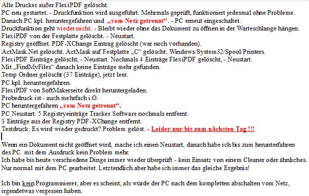 Nach Neuinstallation von FlexiPDF ist der Fehler nun anscheinend beseitigt. Ich habe inzwischen drei Neustarts durchgeführt, und der FlexiPDF-Druckertreiber funktioniert immer noch.