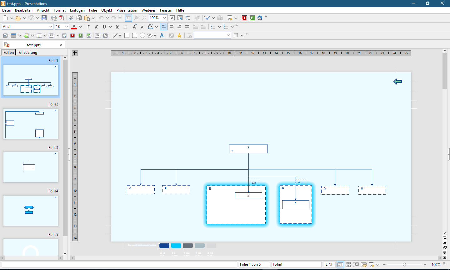OK; die Textbox sieht seltsam aus, der Rest scheint bei mir aber ok.Thomas Wolff hat geschrieben: 05.02.2019 17:49:58 Bei Bearbeitung eines pptx von PowerPoint werden einige Eigenschaften nicht übernommen bzw. nicht unterstützt: